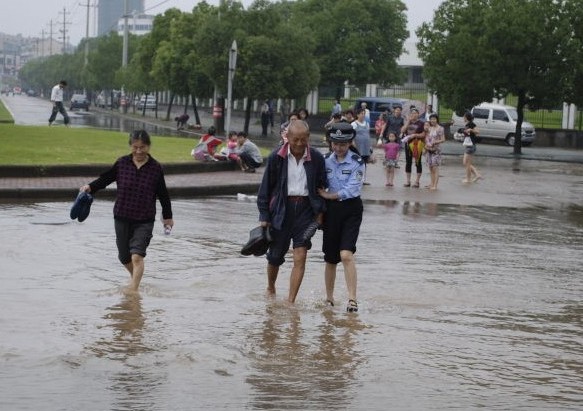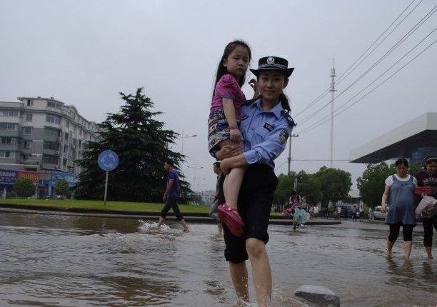 记者在网帖照片中看到,有段路面积满了水,水深盖过人的脚踝,过街的行人都挽起裤脚,提着鞋子小心翼翼地走过。其中一位把裤脚挽到膝盖上,相貌清秀的女城管格外引人注意,她在搀扶一位老人过街后,又抱起一个小女孩横过街道。