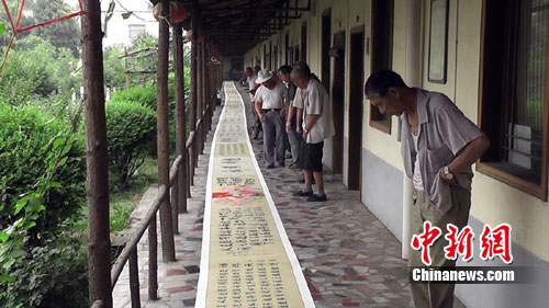 据了解,创作这幅书画长卷的洛阳燎原书画院里的9位老人中,有7位已年逾古稀,他们克服种种困难,历时一个月,完成了这幅长90米、宽90厘米、由9个章节、计9000字组成的书画长卷。