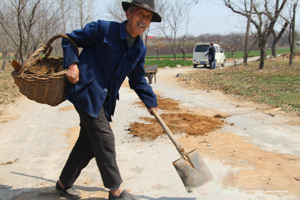 老人有个爱好,就是每天推着独轮车,或者背着土筐去村里捡砖块石子,老人说修路时能用得上。