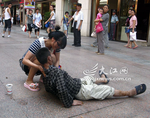 南昌男子满身粪便街头昏迷 陌生女孩为其擦粪(组图)
