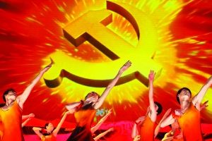 庄严嘹亮的《国际歌》从天际传来,大屏幕上金色的钢水奔流而出,在钢花飞溅中,一个巨大的由镰刀铁锤组成的中国共产党党徽被浇铸而成……昨晚,庆祝中国共产党成立90周年文艺晚会《我们的旗帜》在人民大会堂进行最后一次联排。这段集舞蹈、视频及舞台特效于一体的特殊表演,生动地营造出革命先辈们用热血与钢铁意志铸造理想的震撼画面。