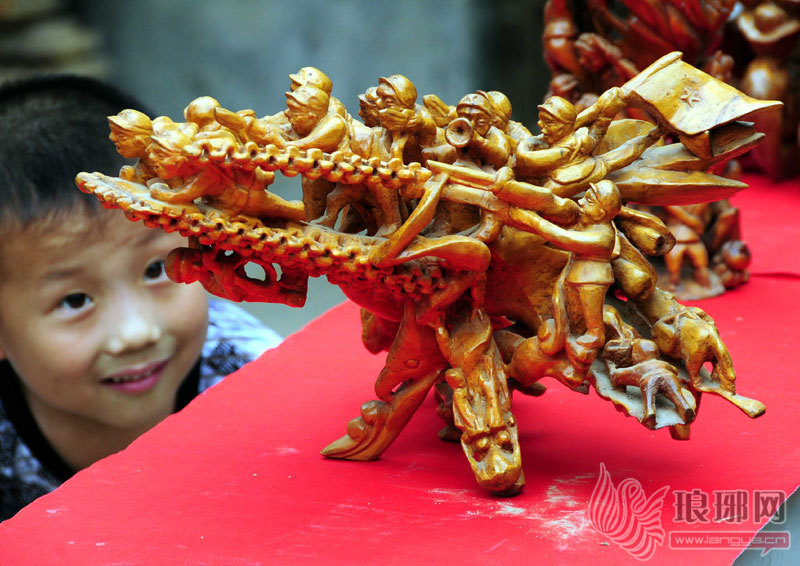 6月22日,在“宋庄宋玉云红色木雕作品展”现场,一名儿童被木雕作品《飞夺泸定桥》所吸引。