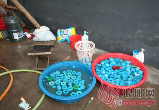 当天上午10点20分左右,质监执法人员根据举报线索,来到位于李官镇一家农家院。打开院门,记者看到在不大的小院中摆满了已灌装好或是未灌装的纯净水桶,而用于灌装和消毒的胶皮管随意地扔在地上,在院子的角落里,两个大盆中用水泡着准备洗刷的桶盖,旁边摆满了各样的洗化用品。