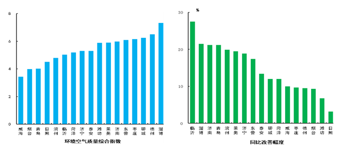 临沂市环境空气质量综合指数为5.03,居全省第6位,同比降低27.5%,幅度居全省第1位;细颗粒物(PM2.5)浓度为39μg/m3,居全省第4位,同比改善31.6%,幅度居第2位;可吸入颗粒物(PM10)浓度为87μg/m3,居全省第8位,同比改善35.1%,幅度居第1位;二氧化硫(SO2)浓度为17μg/m3(达标),居全省第4位,同比改善61.4%,幅度居第1位;二氧化氮(NO2)浓度为35μg/m3(达标),居全省第15位,同比改善25.5%,幅度居第4位;“蓝天白云、繁星闪烁”天数为24天,居全省并列第6位,同比增加6天,幅度居第4位;环境空气生态补偿金模拟核算为462万元,居全省第1位。(山东环境)