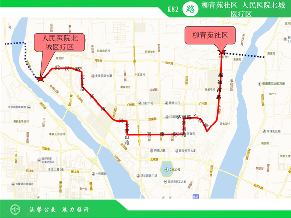 K82路公交线路由柳青苑社区运行至人民医院北城医疗区,线路途经温凉河路、仁和路、沭河路、天津路、大青山路、济南路、艾山路、武汉路。