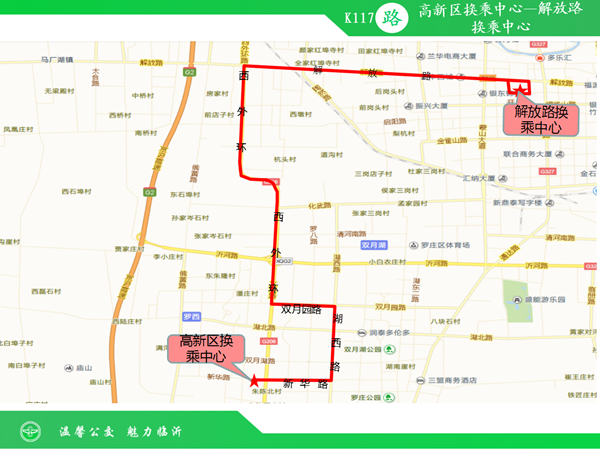 K117路公交线路由高新区换乘中心发车运行至解放路换乘中心,线路途经新华路、湖西路、双月园路、西外环、解放路。