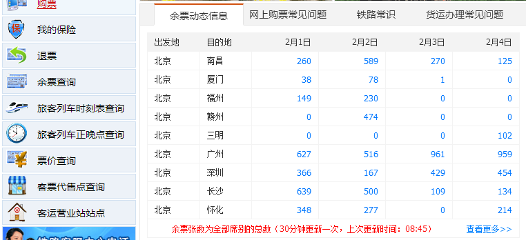 12306官网首页30日起可查余票 每半小时更新一次