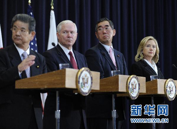 6月21日,在美国首都华盛顿国务院,(左到右)日本防卫大臣北泽俊美、美国国防部长罗伯特·盖茨、日本外务大臣松本刚明和美国国务卿希拉里·克林顿在美日安全磋商委员会会议后出席联合记者会。新华社记者张军摄