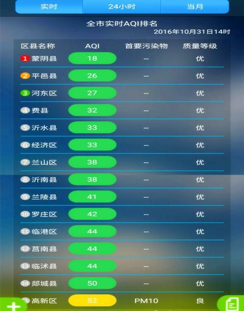 根据临沂市环境空气质量在线监测数据,10月24日,临沂市在全省17地市24小时AQI排名中位居第3,仅次于威海和烟台,AQI为46,无首要污染物,空气质量等级为优。28日,AQI为40,无首要污染物,空气质量等级为优。其余5天空气质量等级分别为良。上周7天均未出现污染天气。