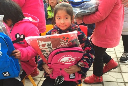 与会领导和爱心人士将新棉衣、新书包发放到孩子手中