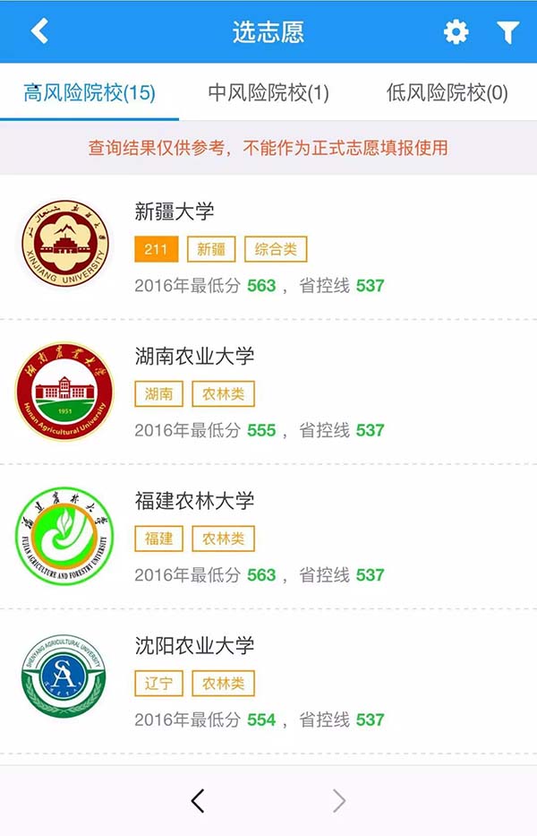 在和博士高考志愿在线服务系统当中,点击『选志愿』输入分数等信息就可以获得系统为您预测的学校。分为高风险,中风险和低风险院校。