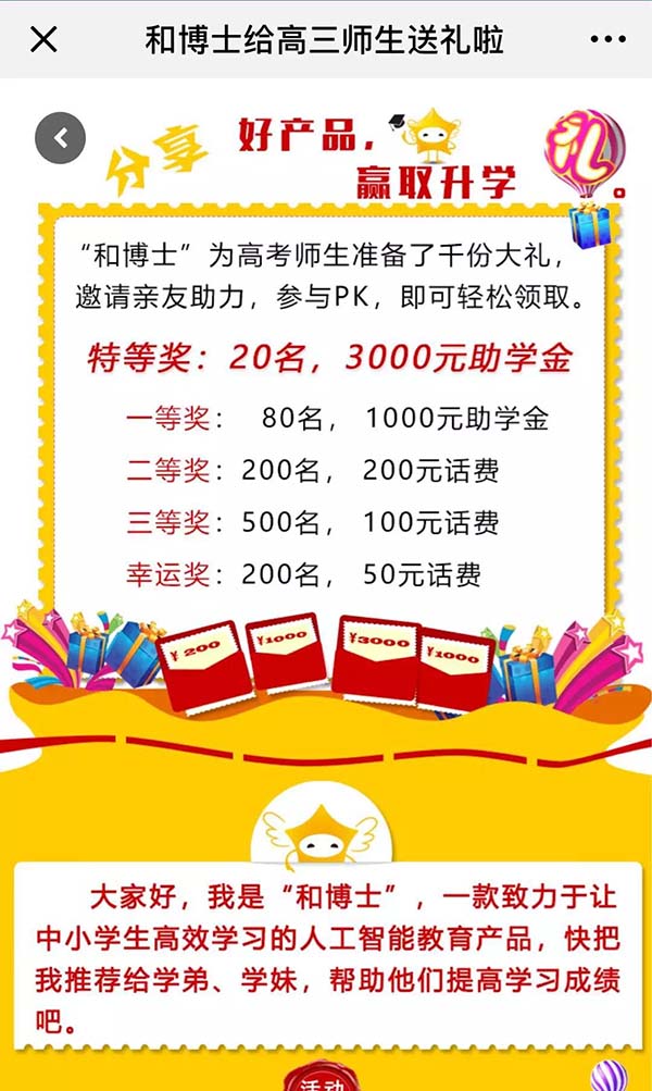 为服务考生,助力高考,和博士特别推出高考季活动,不仅可以为考生们提供高考志愿免费在线服务,还有为广大考生提供了25万元的助学金。