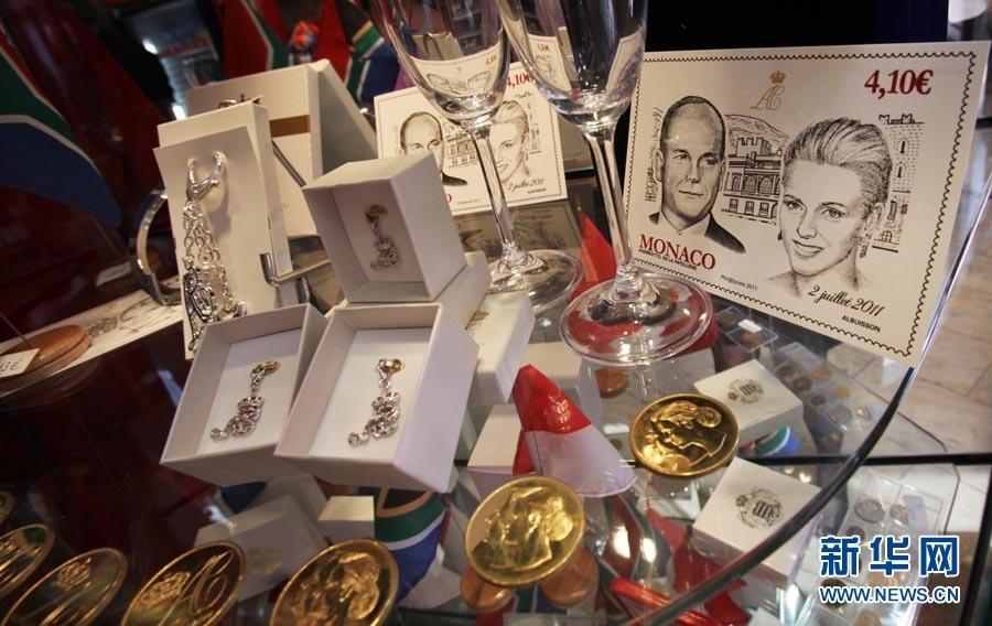 这是7月1日在摩纳哥街头拍摄的摩纳哥亲王阿尔贝二世大婚纪念品。当日,53岁的摩纳哥亲王阿尔贝二世迎娶33岁的南非游泳健将查伦·维特施托克。 新华社记者高静摄