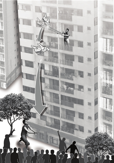 赶到出事的楼下,已经有四五个人在下面。隐约听见保安冲着对讲机喊“10楼……一个孩子。”“要掉下来了!掉下来了!”