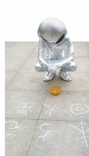 图的主角是个身穿银色连体衣,大脑袋、大眼睛的“ET”(外星人),旁若无人地蹲在闹市区,面前用粉笔写的几个字:“求5元,回火星”。