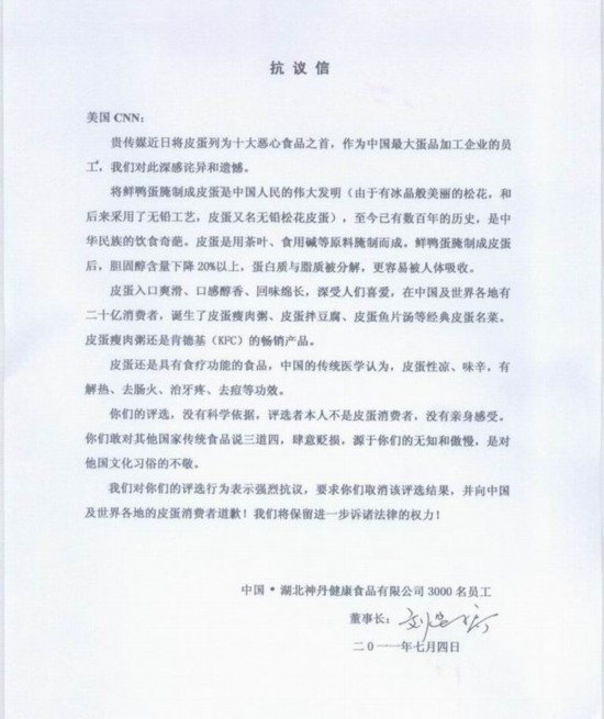 近日,美国有线电视新闻网CNN评全球十大恶心食品,将中国传统食品皮蛋列为第一,此事在中国引来一片抗议声。7月4日,我国最大的蛋品加工企业——湖北神丹健康食品有限公司,以董事长刘华桥及3000名员工的名义正式发函抗议,要求美国CNN道歉。