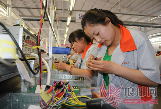 平邑碧陆斯电子公司女工在上班。