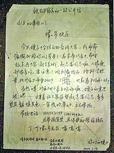 “wangj1123”便是曾经在5舍418住过的学生,“记得很清楚,嫂子当年这封信是被大炮贴到墙上的,每次俺们宿舍4个在房间吃饭前都要瞻仰一下,从此以后418风水好啊,个个感情顺利。有此信在,希望以后入住的师弟们也都感情顺利:)”