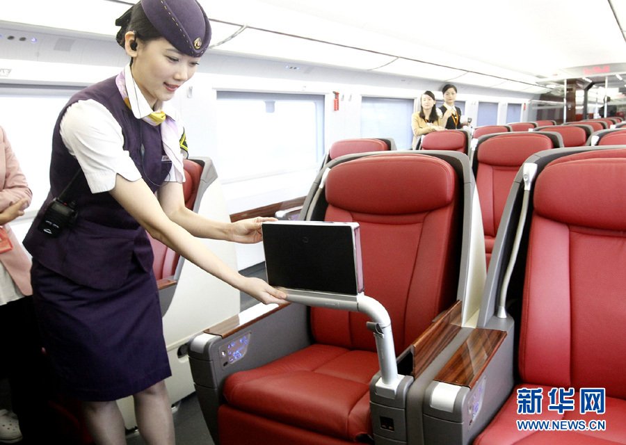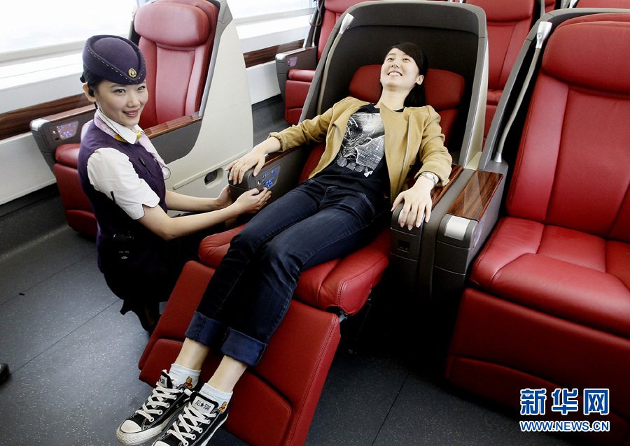 6月16日,高铁列车乘务员正在商务车厢示范操作可随意转变角度的多功能软席座椅,坐姿、半躺、全躺一键到位。当日,上海铁路局组织“京沪高速铁路全程体验乘车”活动,记者登车体验了由上海至北京的千里旅程。上午9点出发的G2次列车,中途只停南京南一站,下午1点48分即到达北京,试验列车的运行时速在300公里左右。列车设有宽敞、整洁,设施完备的一等车厢、二等车厢、餐车、商务车厢以及VIP观光区,列车运行都由我国自主研制的中国高速列车自动控制系统来操控,京沪高铁将于6月底开通运行。新华社记者 陈飞 摄