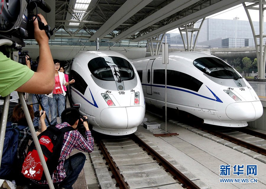 6月16日,京沪高铁测试列车CRH380A动车组(左)整装待发,国产CRH380A动车车头采用全新的流线型车头,在减少气动阻力方面有更好的效果。