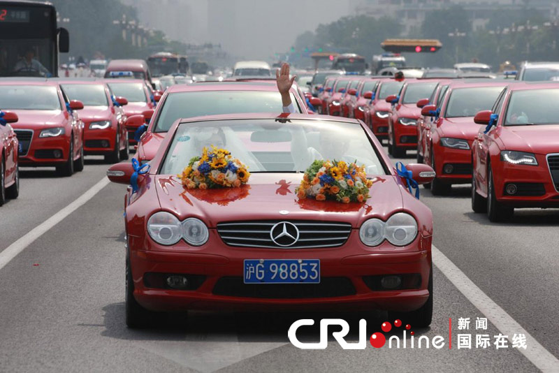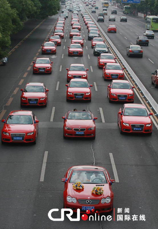 2011年7月10日,北京,35辆奥迪A4和奔驰、宝马组成的结婚车队行驶在长安街上。
