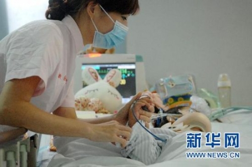 7月11日,护士在重症监护室摆放好妞妞的右手。妞妞的手脚已经有了不自主的运动。