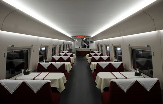 6月12日,一辆停靠在上海虹桥站正在试运行的京沪高铁CRH380A,其卫生间和餐车十分豪华。