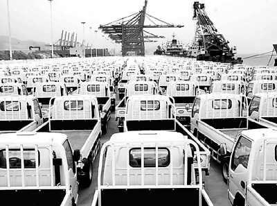图为大批国产车辆停在江苏连云港港口码头等待装船出口国外。王春摄(新华社发)
