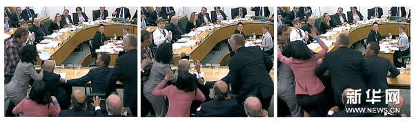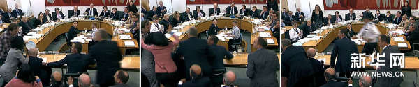 这张7月19日的电视截图拼版画面显示,在英国伦敦议会下院,传媒大亨默多克就窃听事件出席听证会时遭到一名男子持盘子袭击,其妻子邓文迪(身穿粉色衣服)飞身上前保护丈夫。新华社/路透