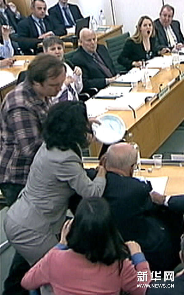 7月19日,在英国伦敦议会下院,传媒大亨默多克(右下)就窃听事件出席听证会时遭到一名男子(左)持盘子袭击(电视截图)。新华社/路透