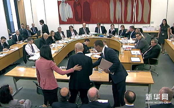 7月19日,在英国伦敦议会下院,传媒大亨默多克(中间站立者)就窃听事件出席听证会(电视截图)。新华社/路透