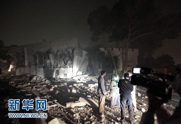 4月25日,在利比亚首都的黎波里,人们站在被轰炸的利比亚领导人卡扎菲的官邸旁。(图片来源:新华网)