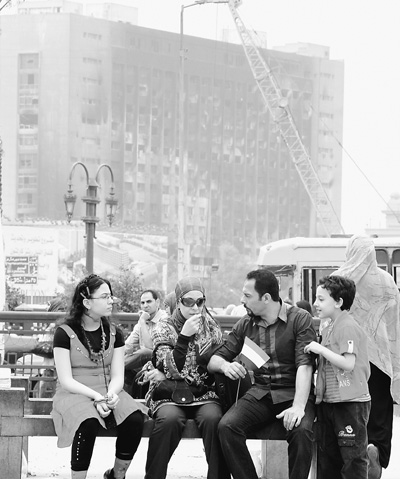 4月27日,一家埃及人在首都开罗市中心的解放广场上享受阳光。在他们身后不远处,是位于尼罗河畔的已被烧毁的前执政党总部大楼。 记者 焦翔 摄