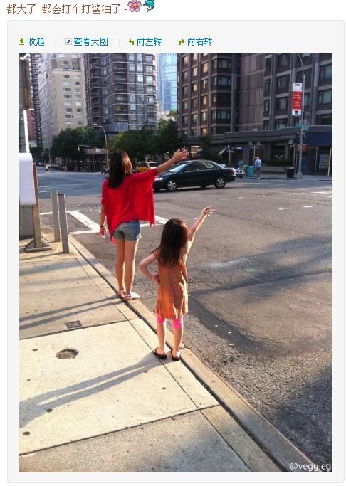 29日,王菲晒两个女儿街头打车照片