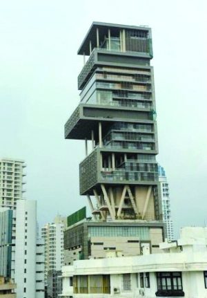 安姆巴尼是印度最大的商业集团信实集团主席,在《福布斯》杂志的富豪排行榜上位列第九,资产额达到270亿美元。去年,安姆巴尼建成这座174米高的多层住宅。这座住宅名叫“安蒂拉”,位于孟买南部,共27层,总楼层面积达3万平方米,住宅内共有9部电梯,3个停机坪,室内设有泳池、健身房、巨型舞厅以及一间电影院。据估计建设成本超过7300万美元。