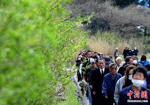4月28日,日本宫城县女川町的男女老幼步行前往祭奠“3·11东北大地震”遇难者49天忌日的活动现场。中新社记者 侯宇 摄