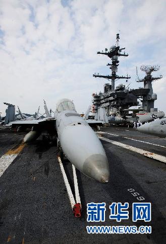 这是美国“乔治·华盛顿”号核动力航空母舰进驻日本横须贺美军基地后,将舰载机停放在飞行甲板上展示(2008年9月25日摄。新华社记者任正来摄