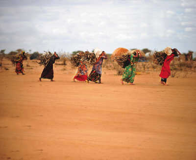 8月6日,在达达布难民营,索马里妇女背着柴火返回住地。由于地处荒漠地带,烧煮食物的燃料严重缺乏,寻找木柴成为难民营里妇女儿童每天最重要的任务。新华社记者 赵颖全摄