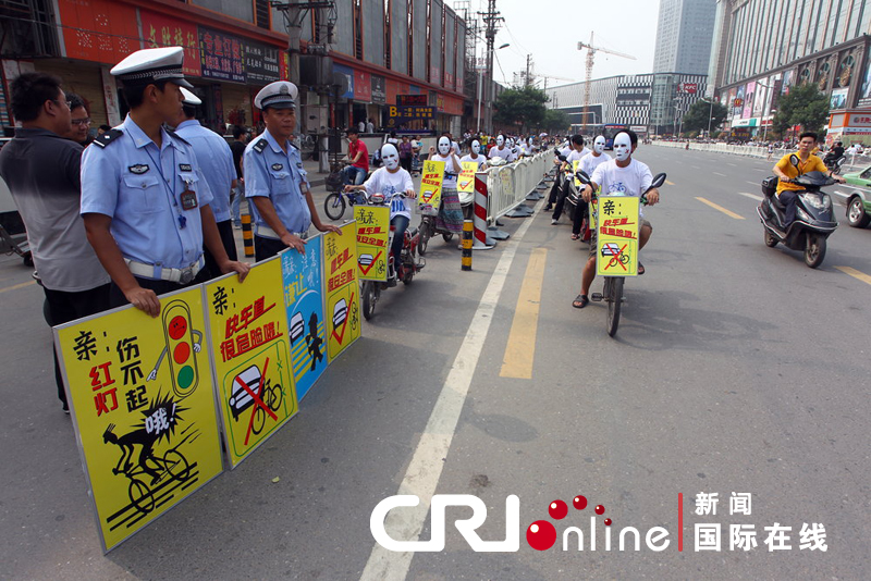 2011年08月10日,河南省郑州市火车站地区,一场交通安全宣传由于融合网络时尚元素而变得与众不同——首次融入交通安全宣传的“淘宝体”,拉近了警民距离,吸引了行人的关注。图片来源:CFP