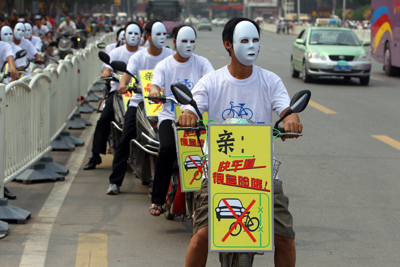 记者在现场看到,戴着白色面具的志愿者,骑着电动车分别穿行在快车道和慢车道上,放置在电动车上、以网络中常见的“淘宝体”式样出现的宣传标语,在无声地向人们宣传“文明出行 各行其道”的重要性。活动的组织者交巡警三大队相关负责人告诉记者,提起交通宣传,人们往往想到的是说教、讲解,此次为提升宣传效果,他们借助年轻人易于接受的网络流行元素,从宣传形式上进行了创新,此举意在倡导大家从我做起,文明出行。“宣传内容使用了大家熟悉的网络语言,感觉很亲切。”对于这种首次出现的宣传形式,过往的行人纷纷表示认同。