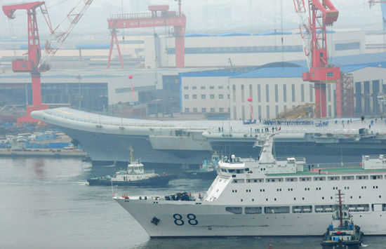 8月14日,中国首艘航母平台早上10时许从海试海域回到辽宁大连,停靠原码头,海军“88”舰也随后返港。至此,我航母平台首次出海航行试验顺利结束。图片来源:CFP