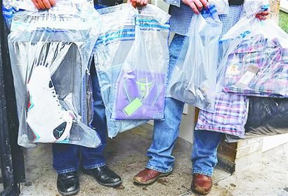 图二:8月11日,在英国首都伦敦,警察追回骚乱中被抢劫和盗窃的财物,其中包括牛仔裤、T恤、皮带和运动鞋等物品。 新华/美联