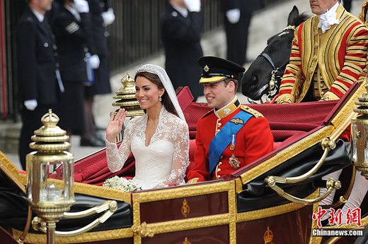 4月29日,英国伦敦,英国威廉王子携手凯特・米德尔顿离开教堂进行婚礼巡游。当地时间11时(北京时间下午5时),英国威廉王子与携手相恋多年的女友凯特・米德尔顿,正式步入婚姻殿堂,举办一场新世纪的“童话婚礼”。