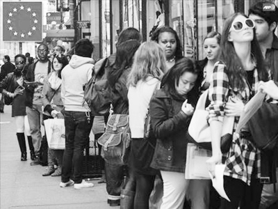 图为排队求职的欧洲失业青年。