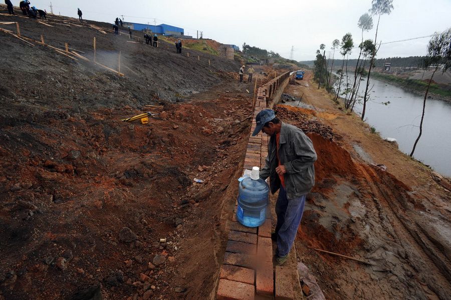 8月14日,云南省曲靖市陆良县,工人为脚下的这28万多吨铬渣“盖房”,这些铬渣紧邻珠江上游的南盘江。