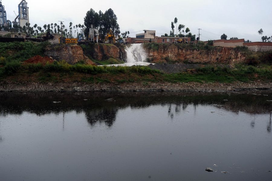 8月14日,云南省曲靖市陆良县,工厂边的南盘江水呈墨黑色。