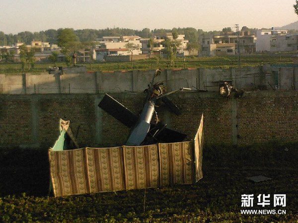 这是5月2日在巴基斯坦阿伯塔巴德拍摄的一架坠毁直升机的残骸。新华社发(卡马尔摄)