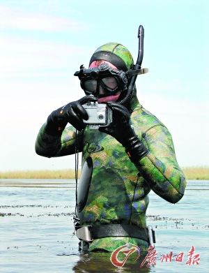 俄罗斯总统梅德韦杰夫身穿潜水服,拿着水下摄像机在拍照。