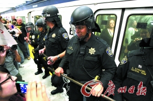 15日,旧金山防暴警察赶到“城市中心”站关闭站台并清场。