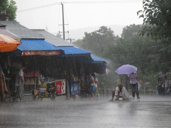 为残疾乞丐老人雨中撑伞女孩(图中)